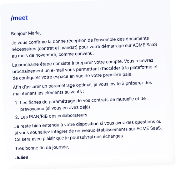 Fini les copier-coller de réponses RH : diffusion de règles internes, relances, messages d’onboarding… tout est prêt à insérer, clair, aligné, et cohérent.
